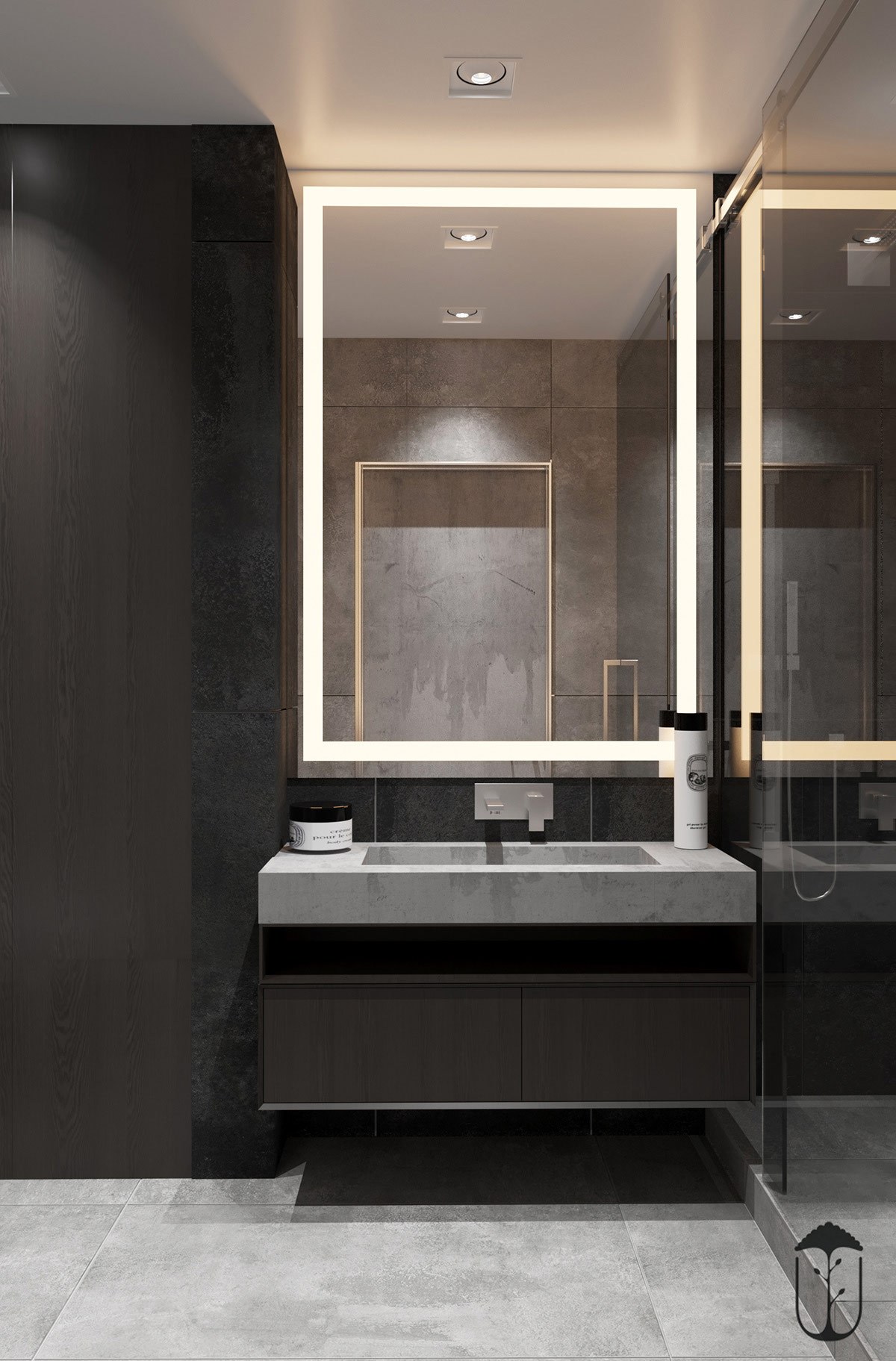 Tủ lavabo đơn giản và hệ tường được ốp đá gạch tối màu giúp căn phòng tắm trông rộng hơn