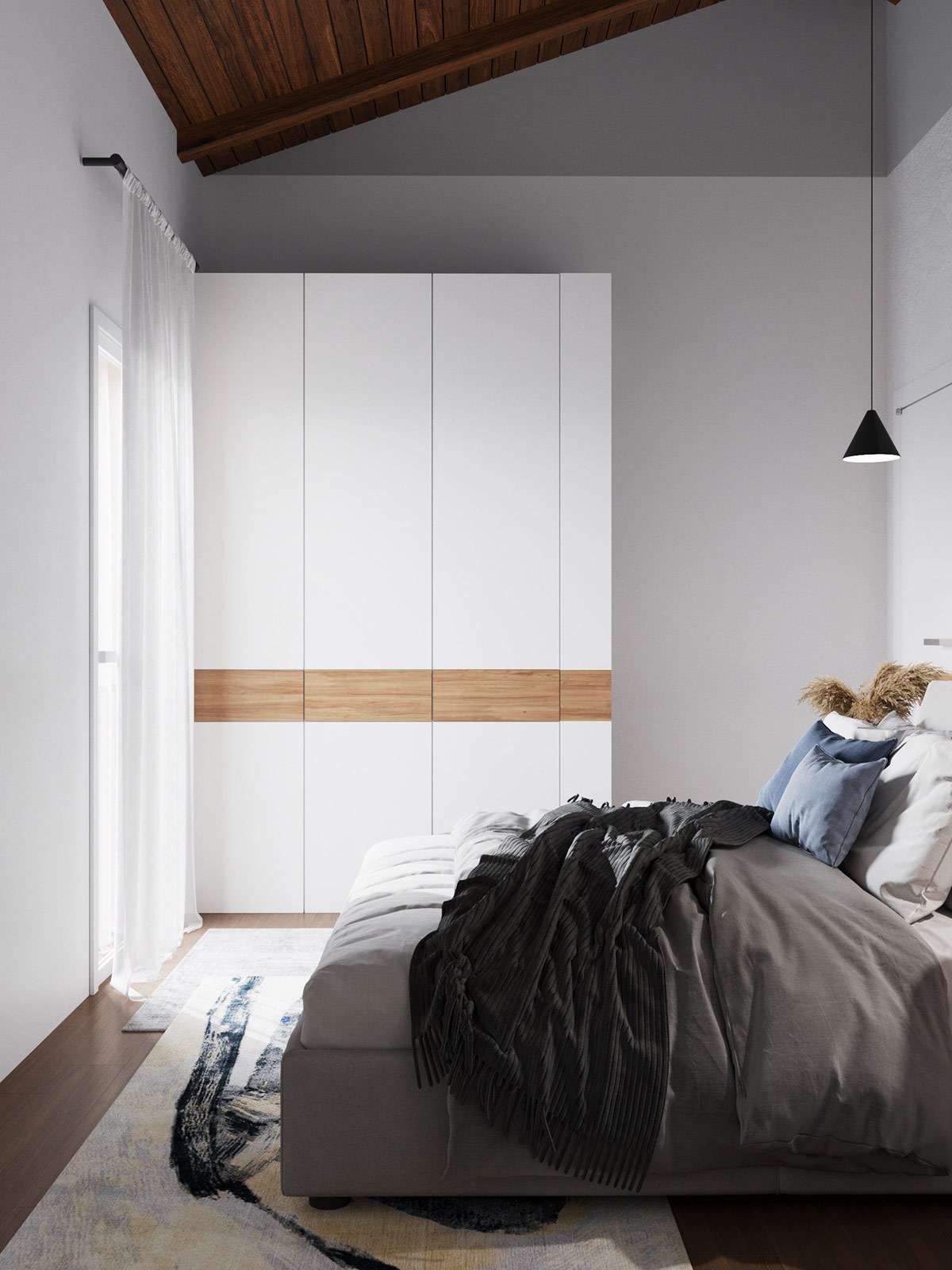 Giá gỗ ngang phía trên giúp căn phòng không còn khoảng trống