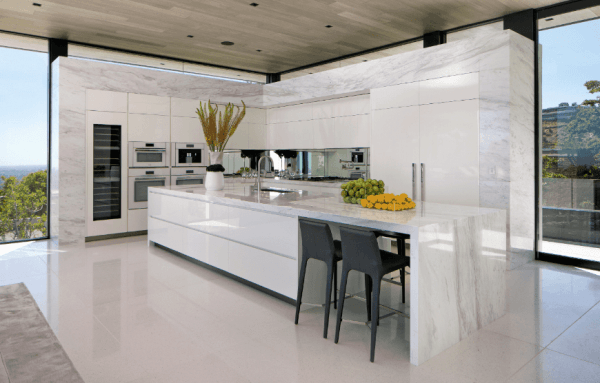Một căn bếp được thiết kế tủ bếp chữ L, quầy bếp và đảo bếp đặt tại trung tâm của căn phòng. Gạch ốp lát màu trắng và mặt bàn màu trắng giúp nổi bật không gian cho căn bếp. Ánh sáng tự nhiên cũng là yếu tố không thể thiếu trong các căn bếp hiện đại này.