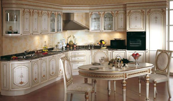 Tông màu kem của tủ bếp, những họa tiết cầu kỳ trên tủ kết hợp bộ bàn ghế mang đậm phong cách cổ điển. Thiết kế nội thất căn bếp mang phong cách này cần sự phối kết hợp hài hòa giữa màu sắc cũng như lựa chọn đồ dùng nội thất, mang đến không gian sang trọng và thuận tiện trong quá trình sử dụng.
