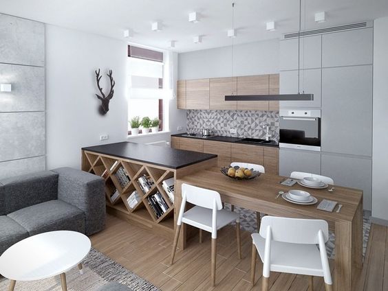 Một thiết kế nội thất căn bếp Scandinavian phù hợp với không gian căn hộ chung cư. Thiết kế tủ bếp chữ I đặt sát tường, đảo bếp kết hợp bàn ăn tạo không gian hiện đại và sang trọng trong quá trình sử dụng.