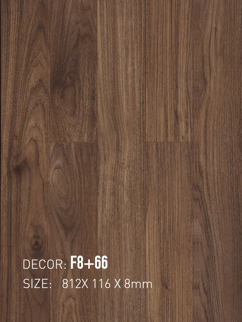 Sàn gỗ F8+66 với màu nâu đậm cổ điển và vân gỗ óc chó (Walnut) dáng xoắn tự nhiên mang đến vẻ đẹp mạnh mẽ và sang trọng, hoàn hảo cho những ai yêu thích phong cách cổ điển và ấm cúng. Với thiết kế bản 116mm và các tính năng ưu việt, mẫu sàn này không chỉ nâng tầm thẩm mỹ mà còn đảm bảo độ bền vượt trội.